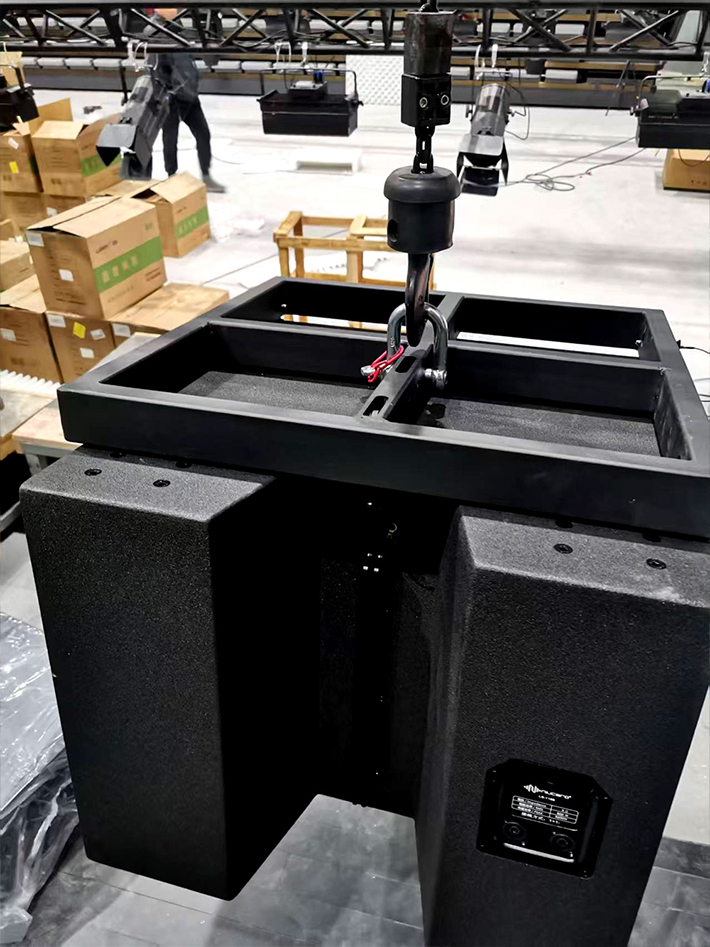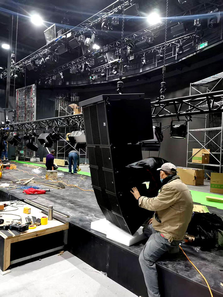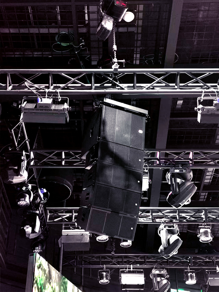 核心配置:采用左右對(duì)稱各4只線陣全頻音箱作為主聲源,輔以各1只線陣次低音箱,通過(guò)2套重型線陣吊架進(jìn)行精準(zhǔn)吊掛安裝。